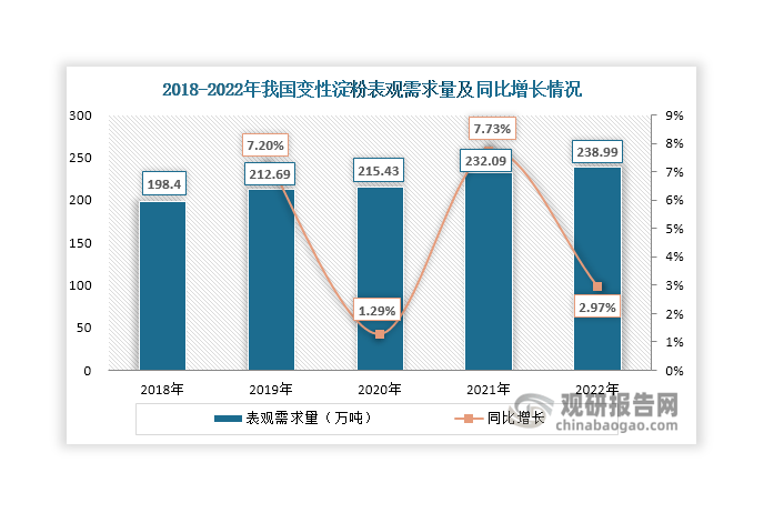 数据来源:中国造纸协会、观研天下整理 4.变性淀粉表观需求量逐年递增,且净进口量呈下降态势 在造纸和食品行业推动下,近年来我国变性淀粉表观需求量逐年递增,2022年达到约238.99万吨,同比增长2.97%。不过,由于我国变性淀粉种类不够丰富且缺乏高端产品,使得其产量难以满足下游需求,部分缺口需依赖进口补齐。