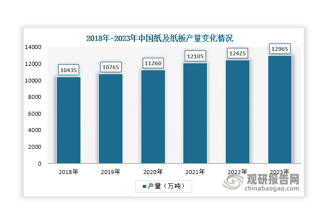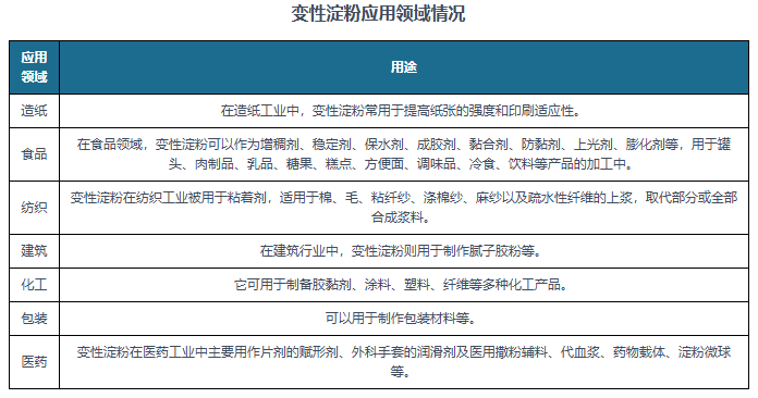 数据来源:中国淀粉工业协会、观研天下整理 由上可见,造纸和食品行业是拉动我国变性淀粉市场需求的主要力量。一方面,我国是全球最大的造纸国,近年来纸及纸板产量持续增长,2023年达到12965万吨,同比增长4.4%,有利于带动变性淀粉市场需求上升。另一方面,在食品领域,变性淀粉可以作为增稠剂、稳定剂、保水剂、成胶剂、黏合剂、防黏剂、上光剂、膨化剂等。随着产品性能不断提升和居民生活水平提高,变性淀粉在食品中的应用领域日益增多,目前可广泛应用于罐头、肉制品、乳品、糖果、糕点、方便面、调味品、冷食、饮料等产品的加工中,为变性淀粉行业带来更多需求。
