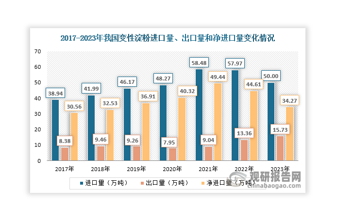 数据来源:观研天下整理 数据显示,近年来我国变性淀粉进口量始终维持在38万吨以上,且呈现先升后降态势,2023年降至50万吨,同比减少13.75%;出口量维持在7万吨以上,且自2021年起持续上升,2023年达到15.73万吨,同比增长17.74%;同时,其净进口量也呈现先升后降态势,2023年大幅下降至34.27万吨,同比下降23.18%。