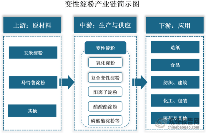 中国变性淀粉行业现状深度分析与发展趋势预测报告(2024-2031年)发表时间:2025-07-28 16:33 1.变性淀粉概述及产业链图解 变性淀粉是经过二次加工、改变了性质的淀粉。其利用物理、化学或酶法处理,在淀粉分子上引入新的官能团或改变淀粉分子大小和淀粉颗粒性质,从而改变淀粉的天然特性(如糊化温度、热粘度及其稳定性、冻融稳定性、凝胶力、成膜性、透明性等),使其更适合于一定应用的要求。 变性淀粉产业链上游为玉米淀粉、马铃薯淀粉等原材料;中游为变性淀粉的生产与供应,根据改性方式不同,其可以分为氧化淀粉、复合变性淀粉、阳离子淀粉等多个品种;下游为应用领域,其被广泛应用于造纸、食品、纺织、建筑、化工、包装、医药等多个领域。