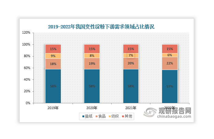 数据来源:中国淀粉工业协会、观研天下整理 3.变性淀粉下游需求结构较为稳定,造纸为第一大需求领域 近年来,我国变性淀粉下游需求结构较为稳定,造纸始终为第一大需求领域,占比超过55%;食品为第二大需求领域,且随着变性淀粉在食品、饮料中的广泛应用,其占比逐年上升,由2019年的18%上升至2022年的22%。