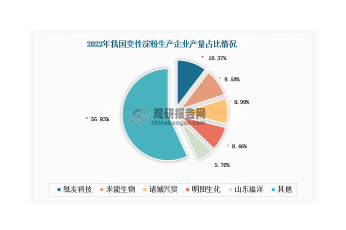 数据来源:中国淀粉工业协会、观研天下整理 2022年我国变性淀粉生产企业数量超过40家,且大部分生产企业的变性淀粉产量均在10万吨以下;仅有5家企业产量突破10万吨,分为是纸友科技、米能生物、诸城兴贸、明阳生化和山东福洋。其中,纸友科技产量占比最大,达到10.37%;其次是米能生物和诸城兴贸,分别占比9.58%和8.9%。