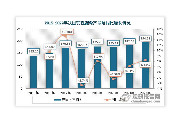 资料来源:公开资料、观研天下整理 2.变性淀粉产量整体呈现增长态势,纸友科技为国内第一大生产商 2015-2022年,在造纸、食品等下游市场推动下,随着变性淀粉生产及研发技术的提高,我国变性淀粉产量整体呈现上升态势,由135.2万吨上升至194.38万吨。其中,复合变性淀粉是国内变性淀粉市场第一大品种,2022年产量占比达到18.22%;其次是氧化淀粉和阳离子淀粉,分别占比17.48%和12.23%。